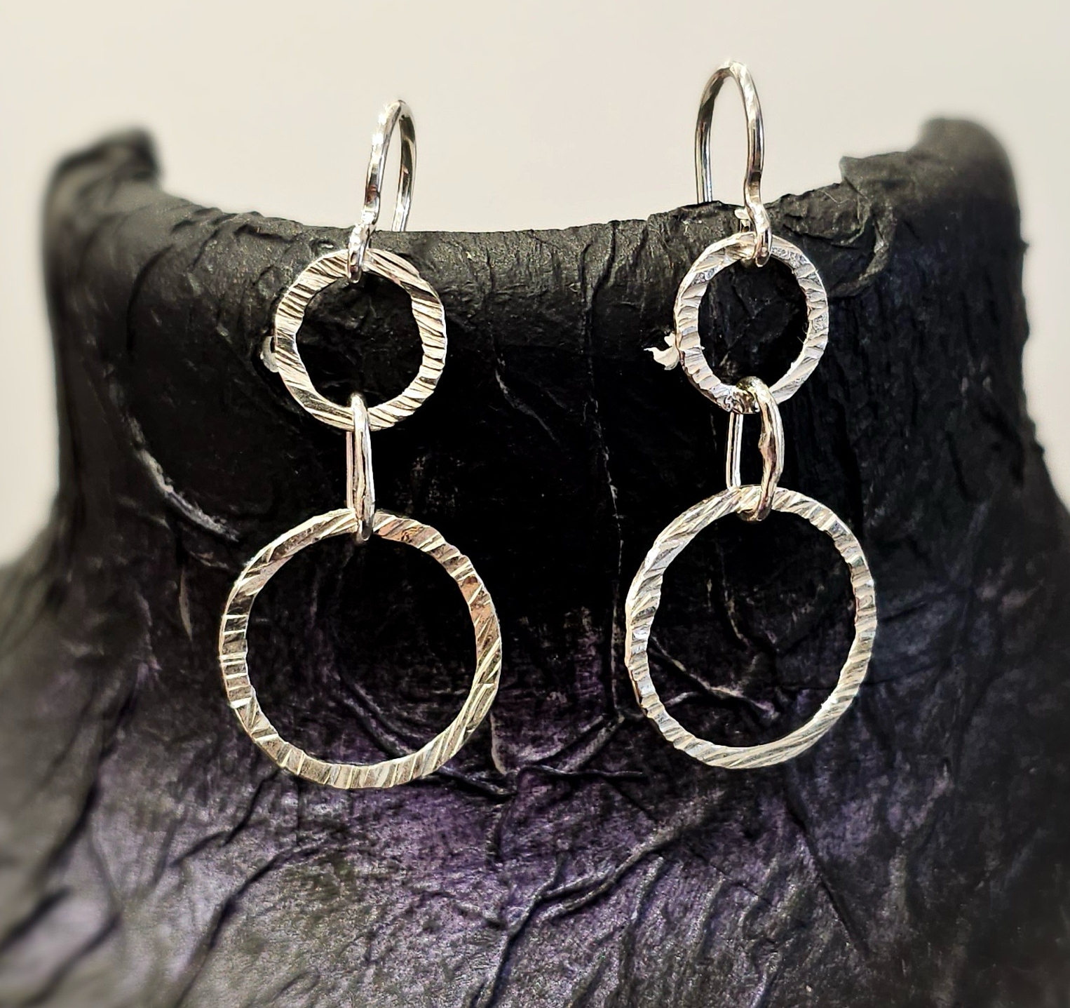 Pendientes colgantes de plata de ley 925 con dos círculos de diferentes tamaños y un acabado de textura martillada.